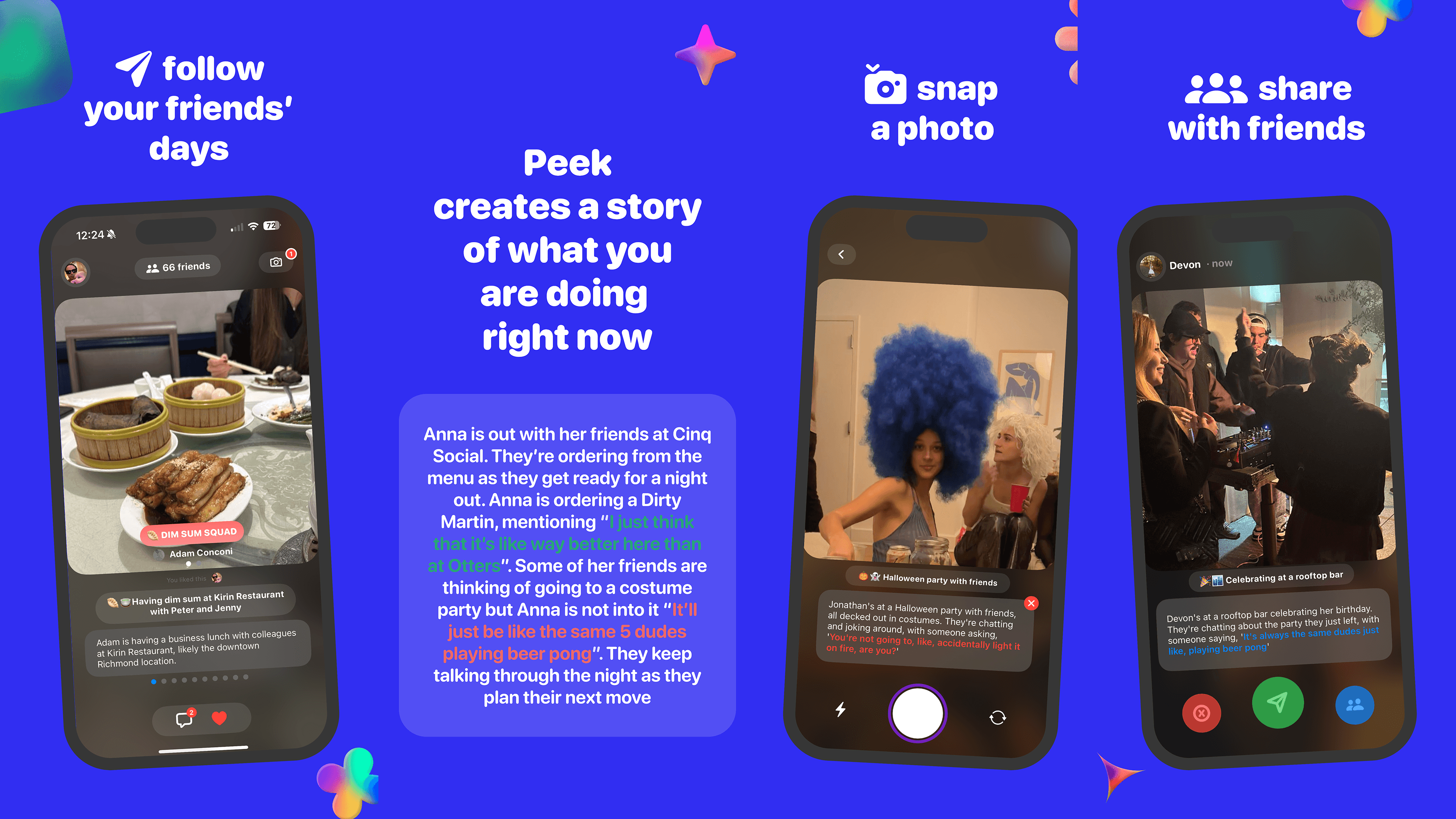 Peek captures the moment you’re living by using ambient audio and location, then lets you snap a photo or video to share a memory story with your friends.